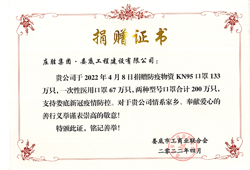 2022年為支持婁底新冠疫情防控捐贈(zèng)中N95口罩133萬只,一次性醫(yī)用口罩67萬只捐贈(zèng)證書